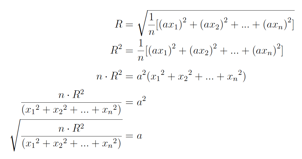 If we know what the desired RMS level should be, it is possible to figure out the scaling factor to perform a linear gain change. This is done by rearranging the equation used to calculate the RMS level to solve for the scaling factor: