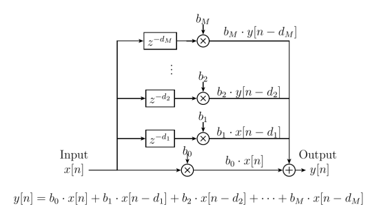 This approach to creating the echo effect allows for precise control because each delay can be set to an independent time. Similarly, the relative gain for each path can be set independently.